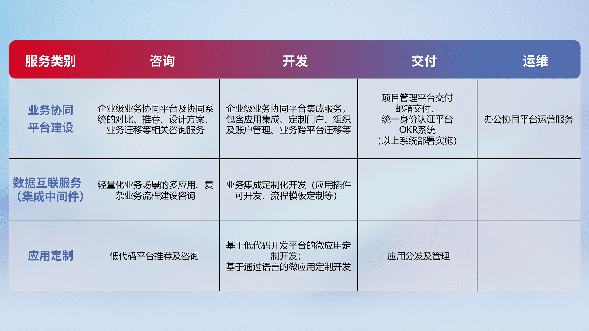 针对钉钉、、企微、、、IDaas等平台级产品提供产品的规划、、方案、、交付、、定制化开发等服务,,,,实现如统一协同办公、、、、智能客户服务、、、、混合会议管理、、、智能数据查询、、等业务场景,,,实现数字化转型。。。