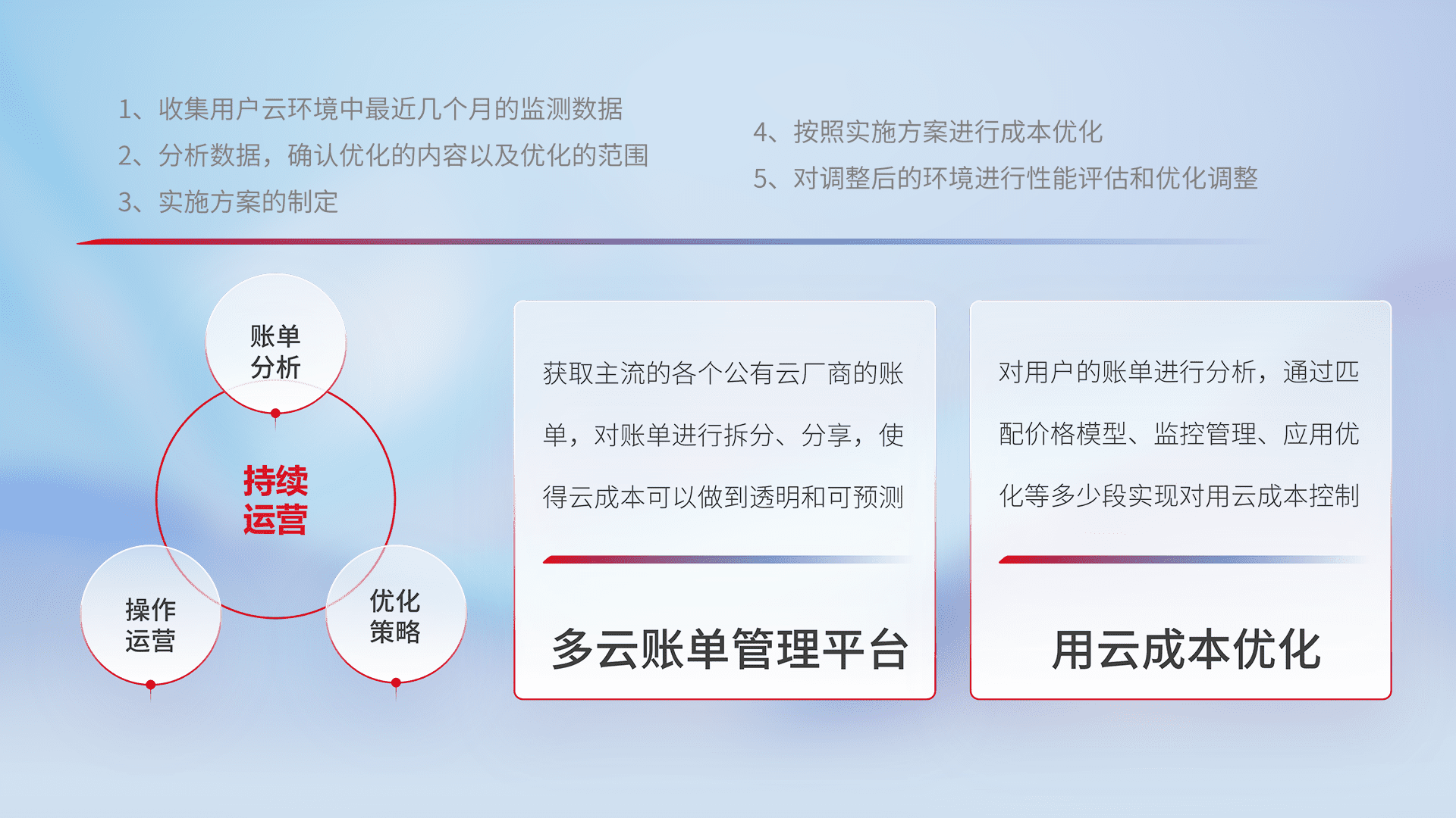 通过多云纳管,,,以统一的资源数据模型把客户的云资源进行抽象和封装,,进而实现对多云资源的统一操作,,,保障云资源管理的可靠性、、、稳定性与可用性。。量身定制化运维内容,,,,配置、、、开发运维、、、、补丁管理、、、、备份、、监控、、认证和访问管理、、、、审计和日常巡检等,,,保障在用云过程中的可靠度,,,,稳定度以及高可用率。。。
